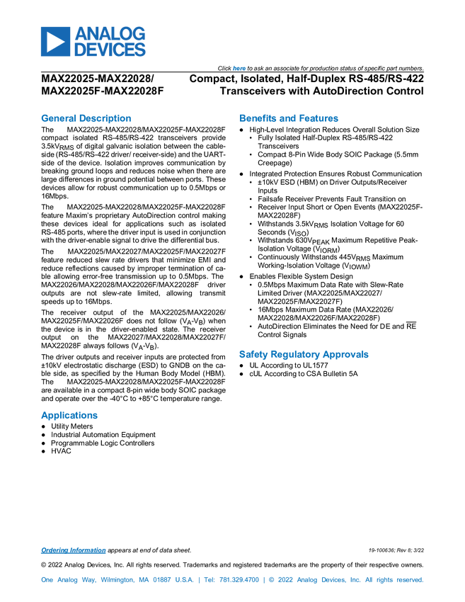 Compact, Isolated, Half-Duplex RS-485/RS-422 Transceivers with AutoDirection Control