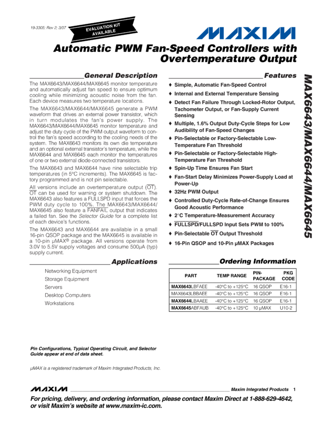 MAX6643, MAX6644, MAX6645 Automatic PWM Fan-Speed Controllers with Overtemperature Output