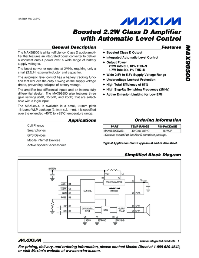 MAX98500 Boosted 2.2W Class D Amplifier with Automatic Level Control