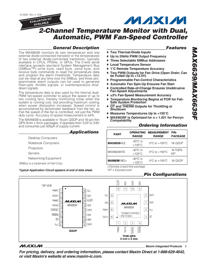 MAX6639, MAX6639F 2-Channel Temperature Monitor with Dual, Automatic, PWM Fan-Speed Controller