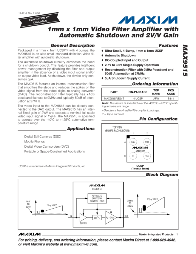 MAX9515 1mm x 1mm Video Filter Amplifier with Automatic Shutdown and 2V/V Gain