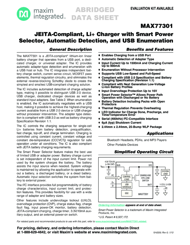 MAX77301 JEITA-Compliant, Li+ Charger with Smart Power Selector, Automatic Detection, and USB Enumeration