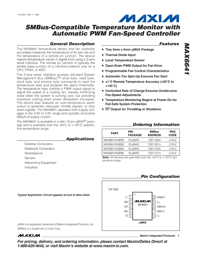 MAX6641 SMBus-Compatible Temperature Monitor with Automatic PWM Fan-Speed Controller