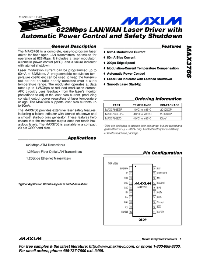 MAX3766 622Mbps LAN/WAN Laser Driver with Automatic Power Control and Safety Shutdown