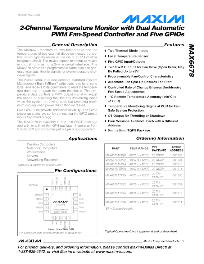 MAX6678 2-Channel Temperature Monitor with Dual Automatic PWM Fan-Speed Controller and Five GPIOs