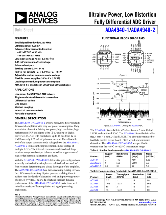 ADA4940-2: Ultralow Power, Low Distortion ADC Driver