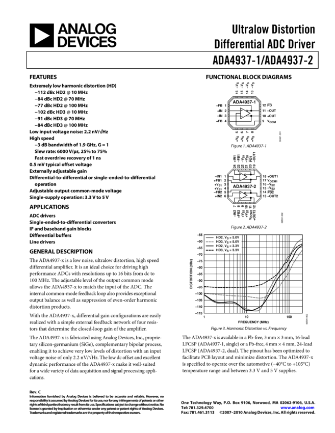 ADA4937-1: Ultralow Distortion Differential ADC Driver (Single)