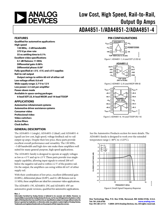 ADA4851-1: Low Cost, High Speed, Rail-to-Rail, Output Op Amp (Single)