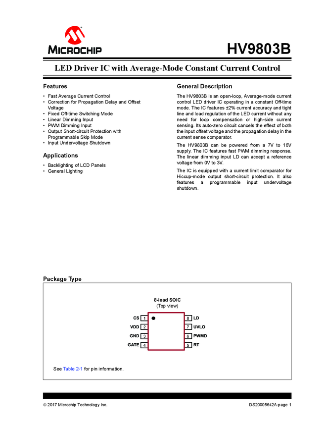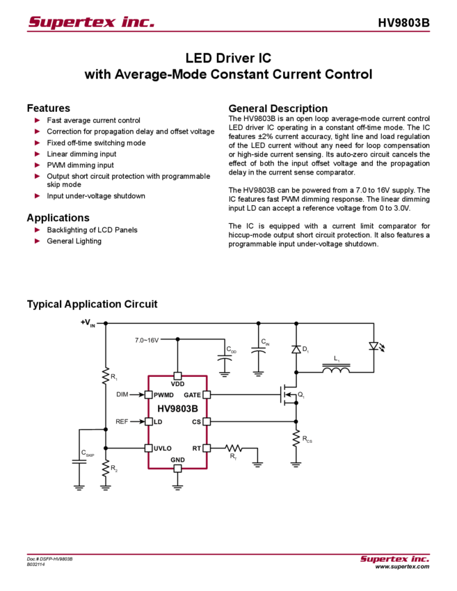 HV9803B Datasheet - LED Driver with Average-Mode Constant Current Control (08/27/2014)