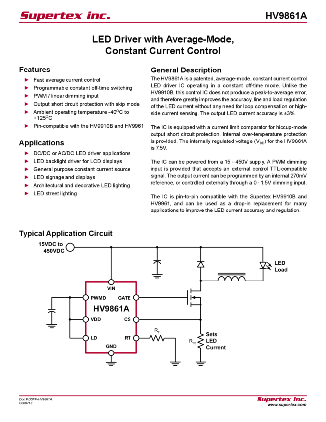HV9861 Datasheet - LED Driver with Average-Mode, Constant Current Control (06/22/2014)