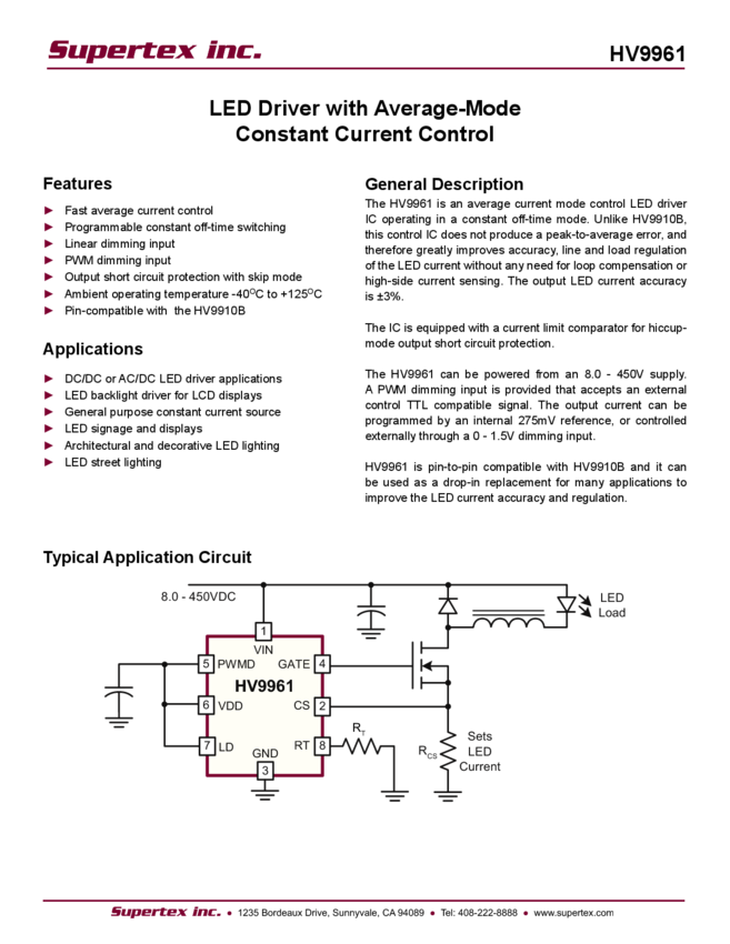 HV9961 Datasheet - LED Driver with Average-Mode Constant Current Control (10/15/2010)