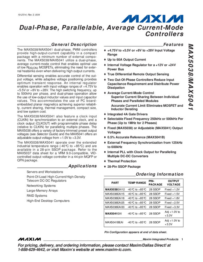 MAX5041 Dual-Phase, Parallelable, Average Current-Mode Controller