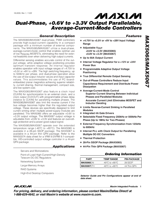 MAX5065, MAX5067 Dual-Phase, +0.6V to +3.3V Output Parallelable, Average-Current-Mode Controllers