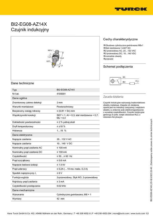 Czujnik indukcyjny Turck BI2-EG08-AZ14X, 20 - 132 V, 1 szt.