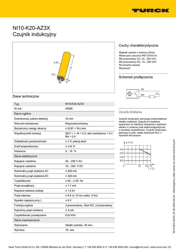 Turck Czujnik indukcyjny nie podtynkowy NI10-K20-AZ3X