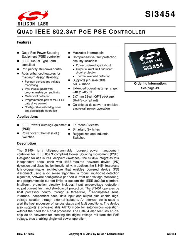 Quad-Port Power Sourcing Equipment Controller 38-Pin QFN