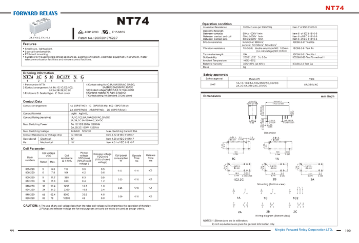 Przekaźnik; NT74-1CSN8 12VDC; elektromagnetyczny; 12V DC; 8A; 250V; SPDT 1 styk przełączny; na PCB; = JS-12-K; RM96-3011-35-1012; RM96-1011-35-1012; V23061-B1005-A401, AZ6963-1CB-12DE; Ningbo Forward Relay Corporation;RoHS