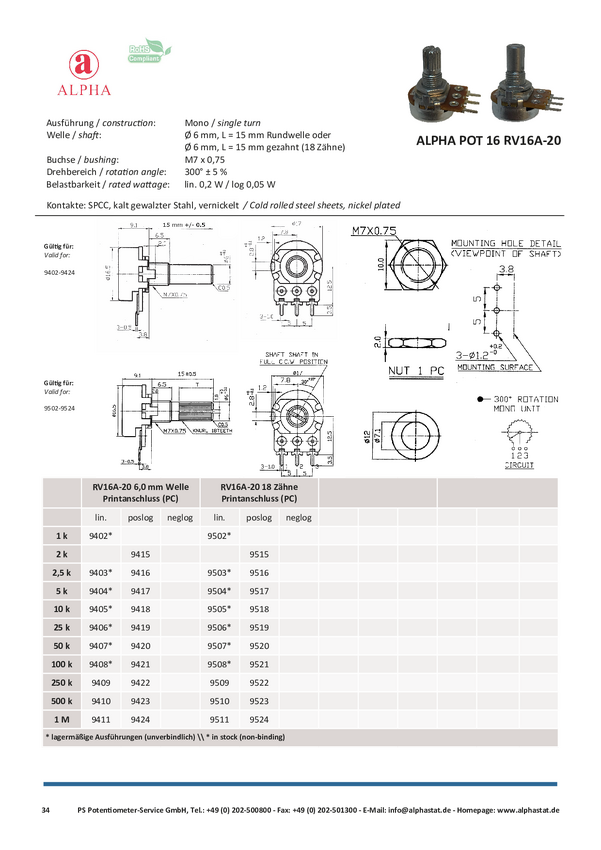 Potencjometr z przełącznikiem Potentiometer Service GmbH PC20BU/HS4 CEPS F1 L:65 B100K