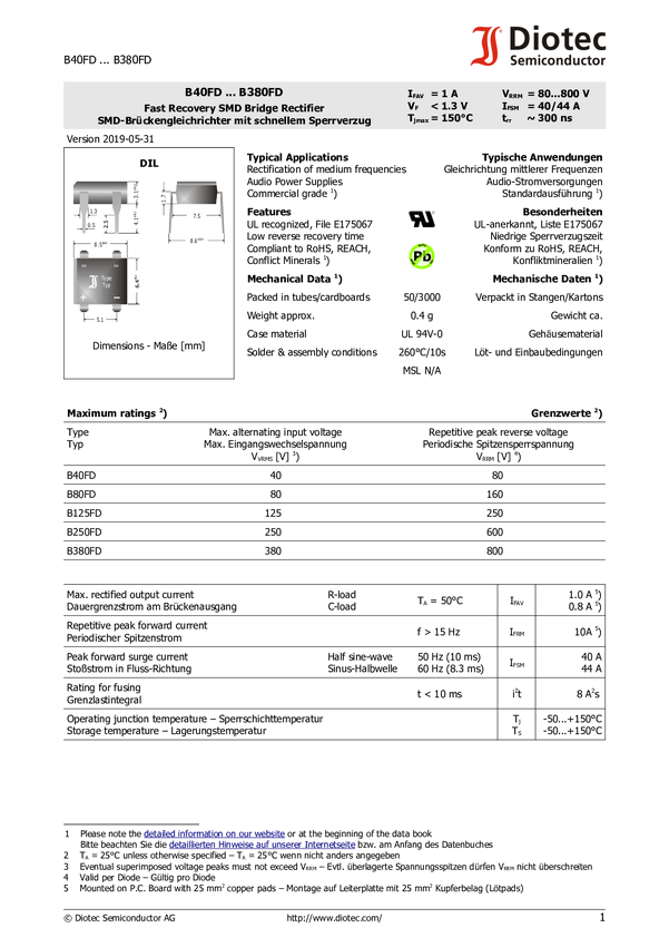 Diotec B125FS Prostownik mostkowy DIL 250 V 1 A