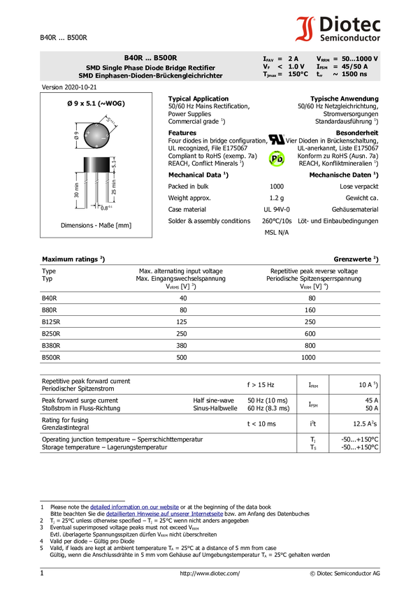 Diotec B125R Prostownik mostkowy D9x5 250 V 1 A