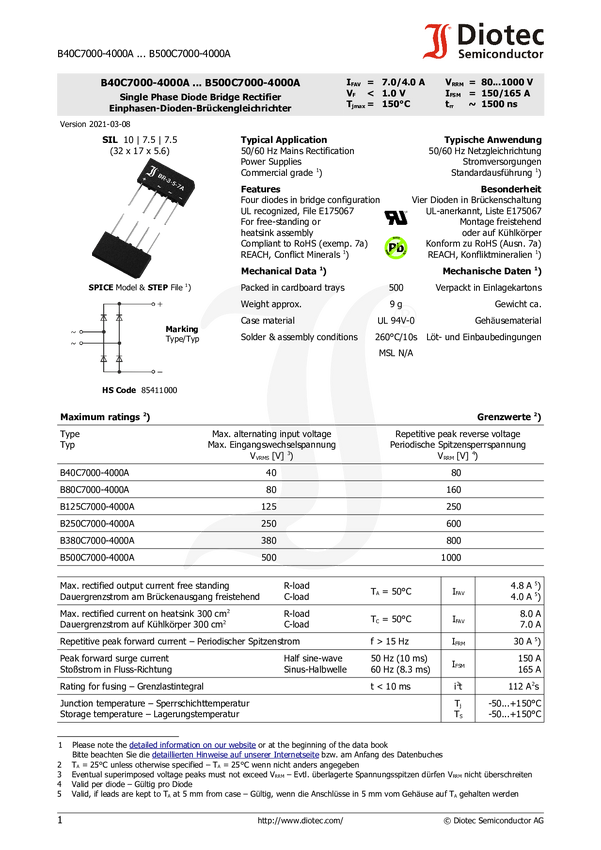 Diotec B125C7000A Prostownik mostkowy GBI 250 V