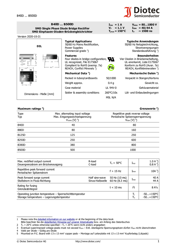 Diotec B125D Prostownik mostkowy DIL 250 V 1 A