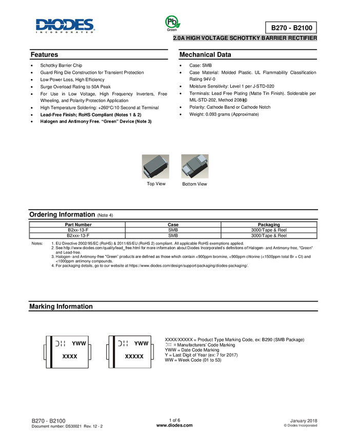 Dioda; B2100-13-F; prostownicza; Schottky; 2A; 100V; DO214AA (SMB); SMD; KINGTRONICS; RoHS; opakowanie/100szt