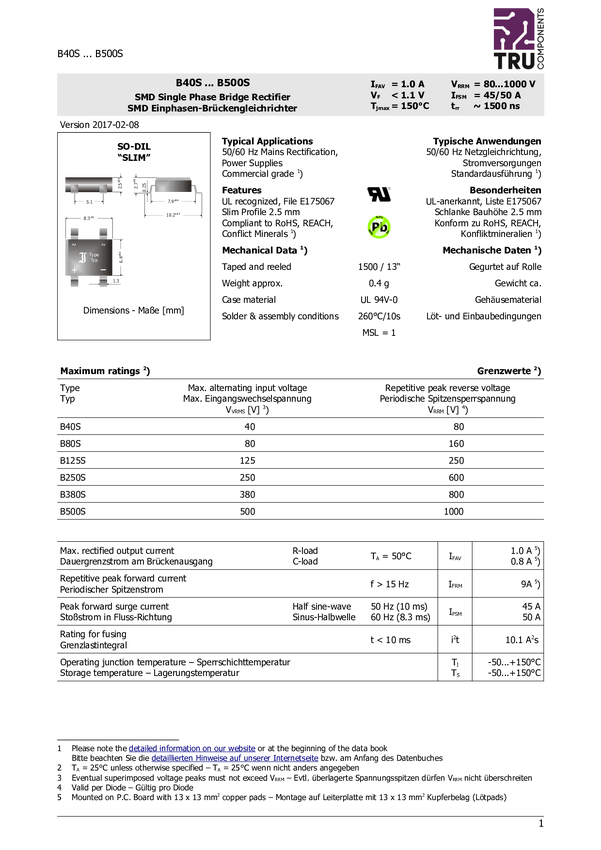Prostownik mostkowy TRU COMPONENTS TC-B250S-SLIM, 600 V, 1 A