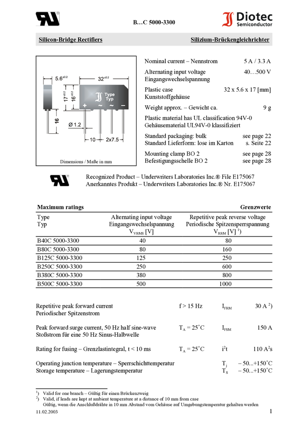 Diotec B250C5000A Prostownik mostkowy SIL-4 600 V 5 A Jednofazowy
