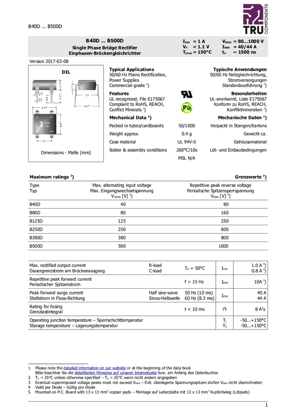 Prostownik mostkowy TRU COMPONENTS TC-B250D, 600 V, 1 A