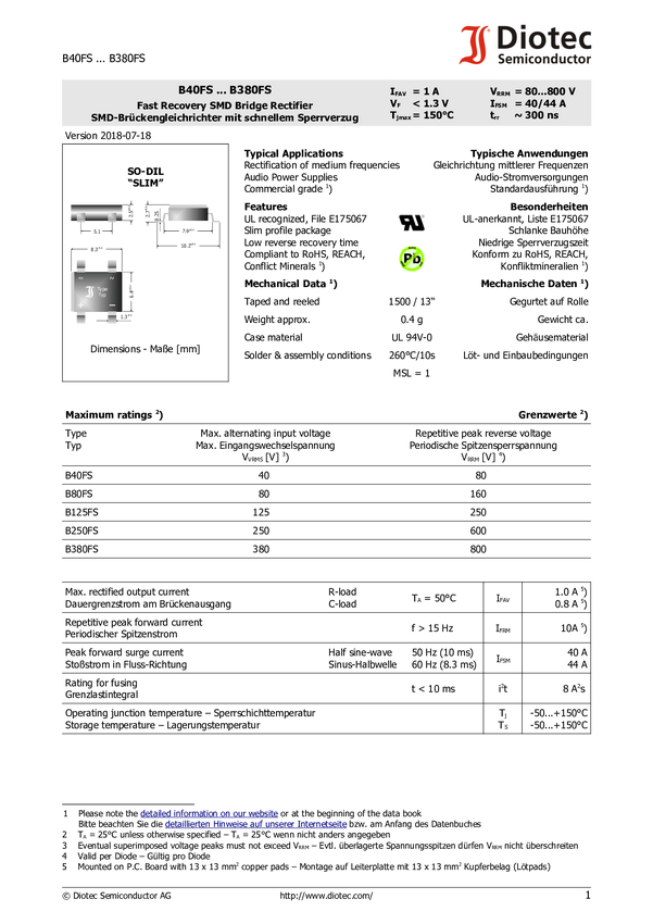 Diotec B250FS Prostownik mostkowy DIL 600 V 1 A