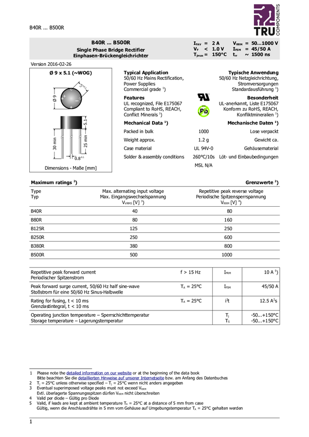 Prostownik mostkowy TRU COMPONENTS TC-B250R, 600 V, 2 A