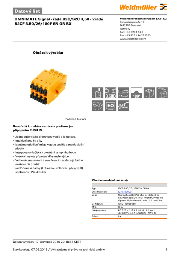 Weidmüller 1277790000 Obudowa złącza pin żeńskiego na kabel B2CF 3.50/26/180F SN OR BX, 30 szt.