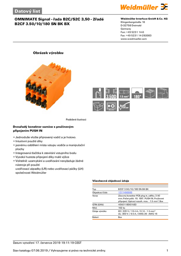 Weidmüller 1277490000 Obudowa złącza pin żeńskiego na kabel B2CF 3.50/10/180 SN BK BX, 102 szt.