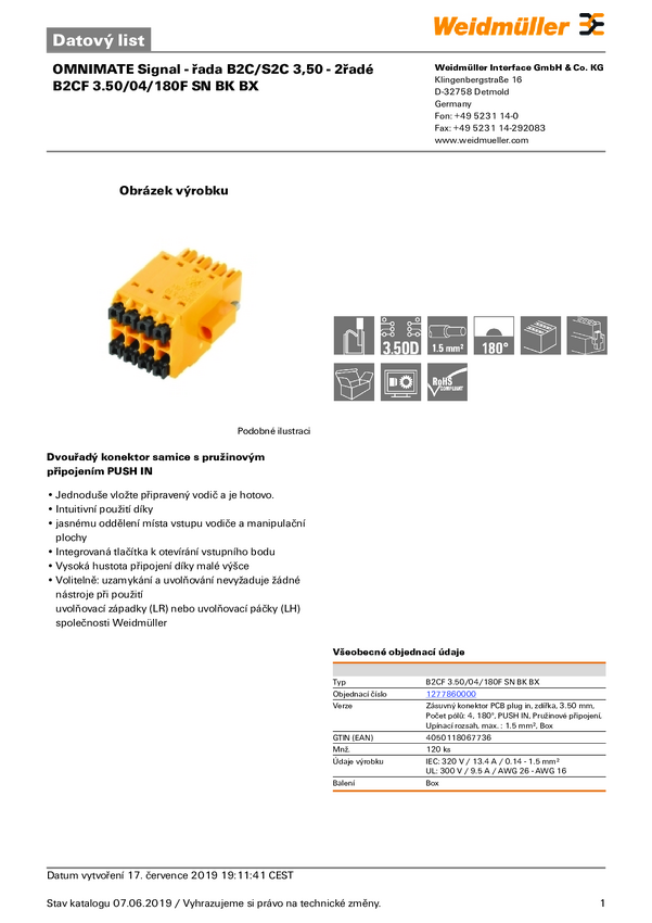 Weidmüller 1277860000 Obudowa złącza pin żeńskiego na kabel B2CF 3.50/04/180F SN BK BX, 120 szt.
