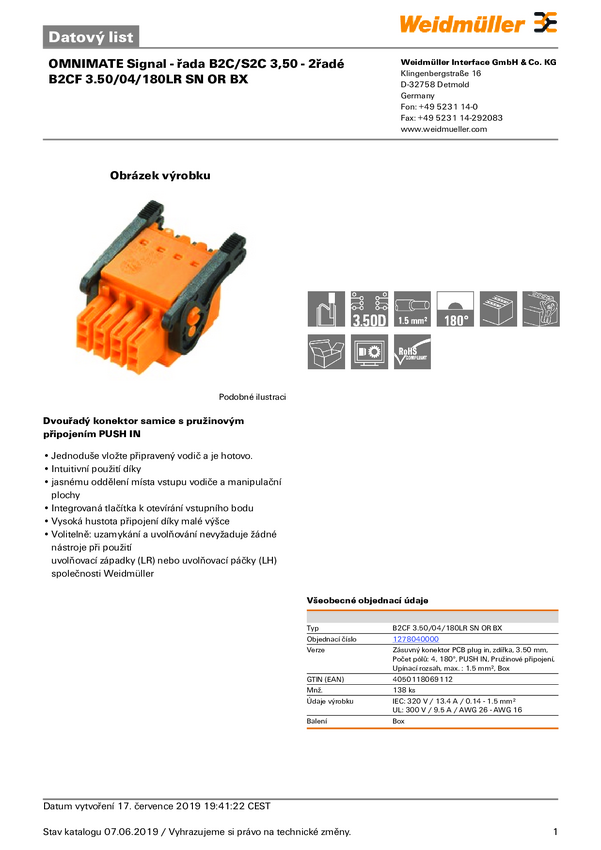 Weidmüller 1278040000 Obudowa złącza pin żeńskiego na kabel B2CF 3.50/04/180LR SN OR BX, 138 szt.
