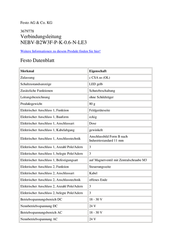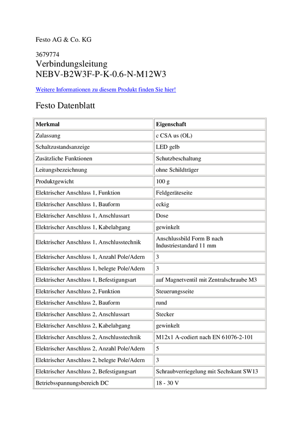 FESTO 3679778 Kabel połączeniowy czujnika/aktuatora NEBV-B2W3F-P-K-0.6-N-LE3, 0.60 m, 1 szt.