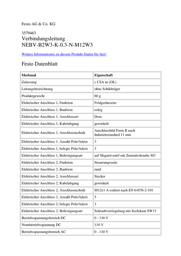 FESTO 3579463 Kabel połączeniowy czujnika/aktuatora NEBV-B2W3-K-0.3-N-M12W3, 30.00 cm, 1 szt.