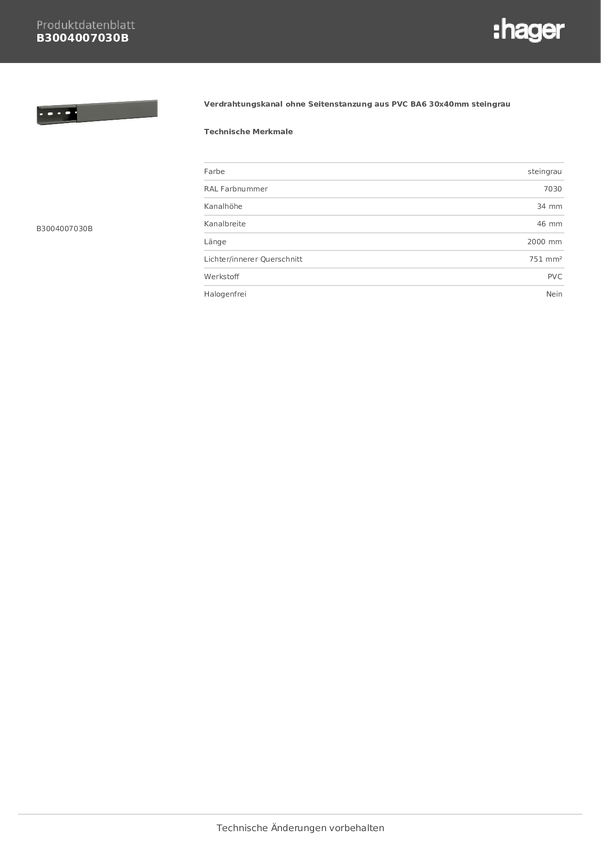Kanał na wiązki Hager B3004007030B B3004007030B (D x S x W) 2000 x 46 x 34 mm 2 m