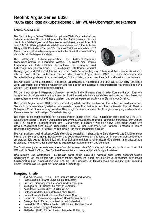 Kamera monitoringu IP Reolink Netzwerkkamera Argus Series B320 - B WLAN 2304 x 1296 px