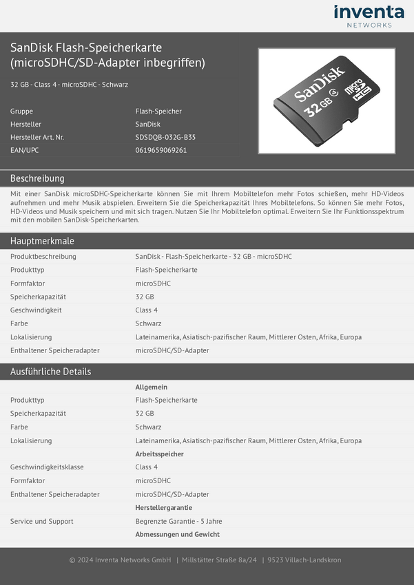 Karta SanDisk microSDHC 32 GB Class 4 wraz z pakietem zdjęć adaptera SD