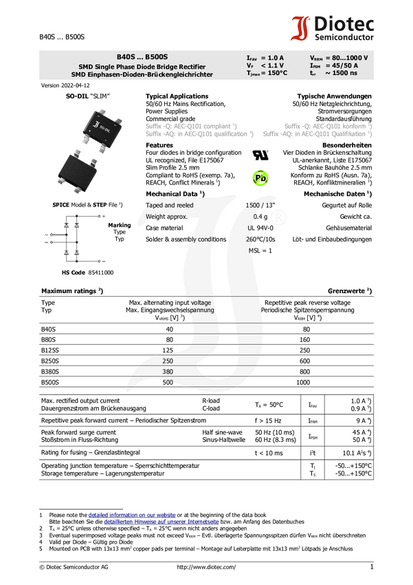 Diotec B380S15A Prostownik mostkowy SO-DIL SLIM 800 V 1.50 A