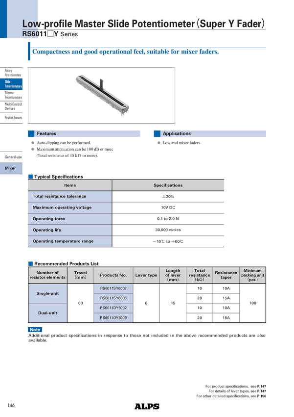 Potencjometr suwakowy Alps, travel 60 mm, Audio, mono wymiary: długość: 75mm; szerokość:9mm mm; rozstaw śr.71 mm; wodzikmetalowy 15mm code 6, rez.10 kohm Y taper