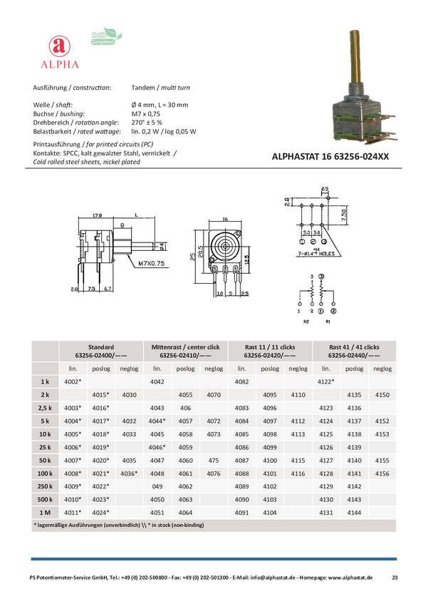 Potentiometer Service RD1602F-20B4-30R6-B50k-602 63256-02400-4007/B50K Potencjometr obrotowy 1-obrotowy stereo 0.2 W 50