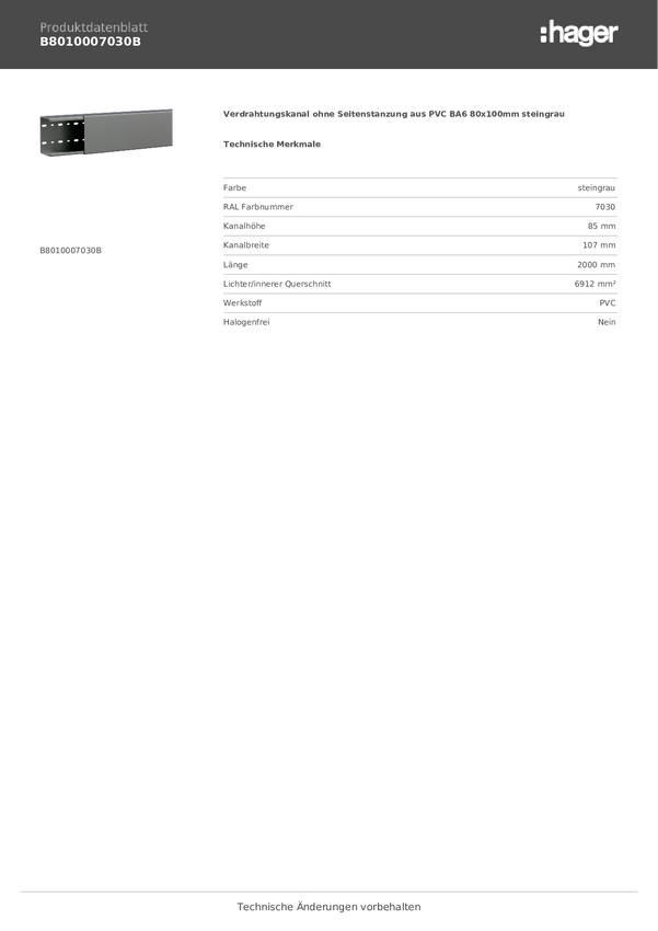 Kanał na wiązki Hager B8010007030B B8010007030B (D x S x W) 2000 x 107 x 85 mm 2 m
