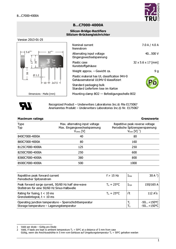 Prostownik mostkowy TRU COMPONENTS TC-B80C7000A, 160 V, 7 A