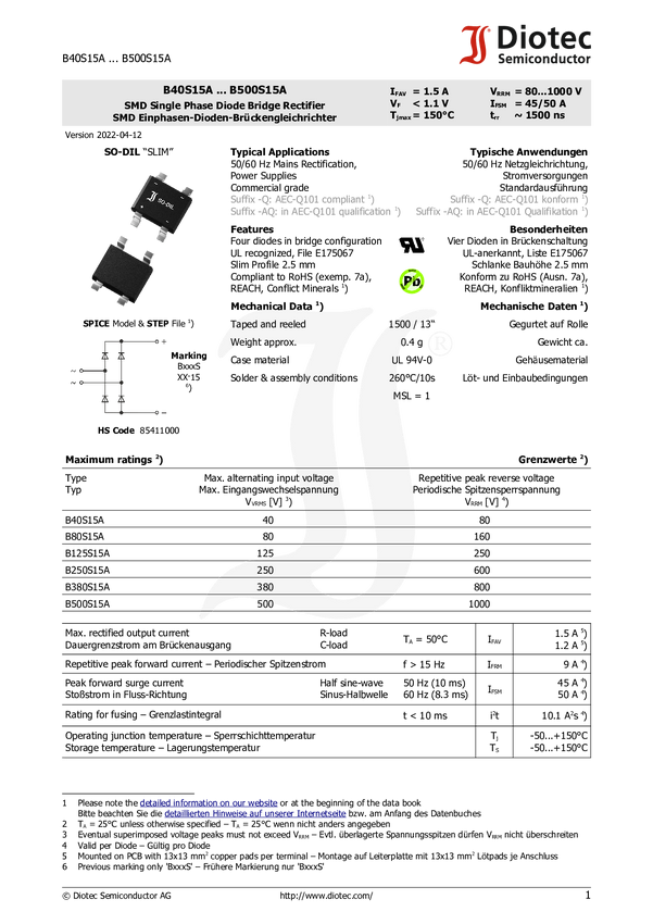 Diotec B80S15A Prostownik mostkowy SO-DIL SLIM 160 V 1.50 A