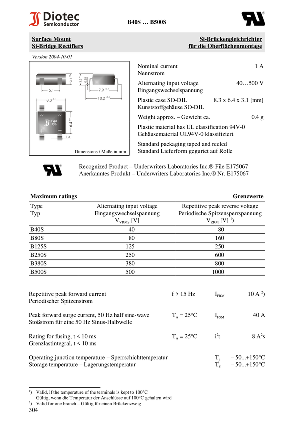 Diotec B80S15A Prostownik mostkowy SO-DIL SLIM 160 V 1.50 A