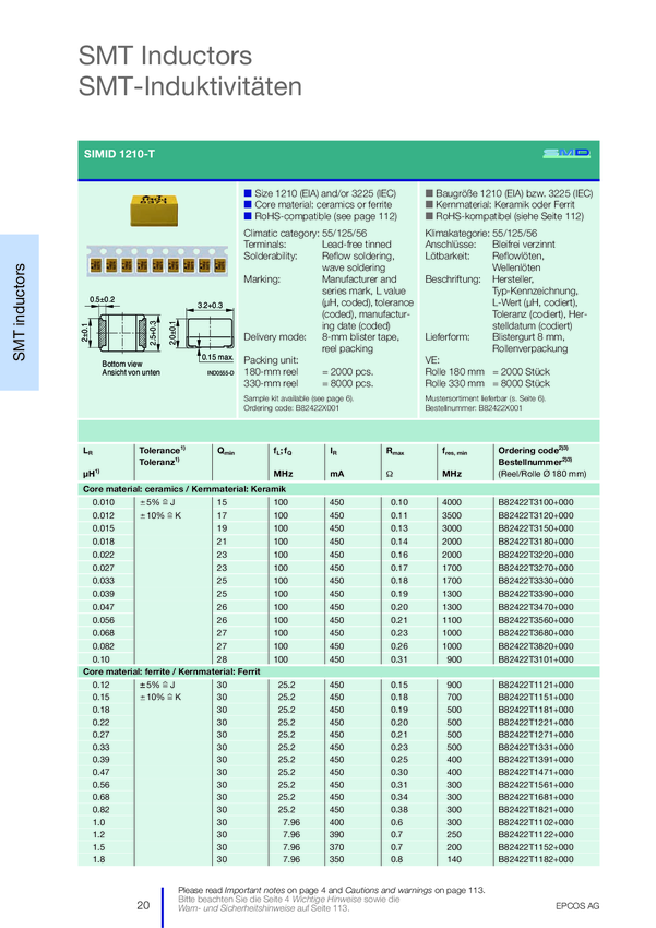 Ind 3.9uH 5% 7.96MHz 30Q-Factor Ferrite 250mA 1210 Blister T/R