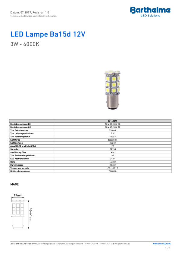 Barthelme 52143015 Lampka sygnalizacyjna LED biały BA15D 10 V/DC, 30 V/DC, 10 V/AC, 18 V/AC 350 lm